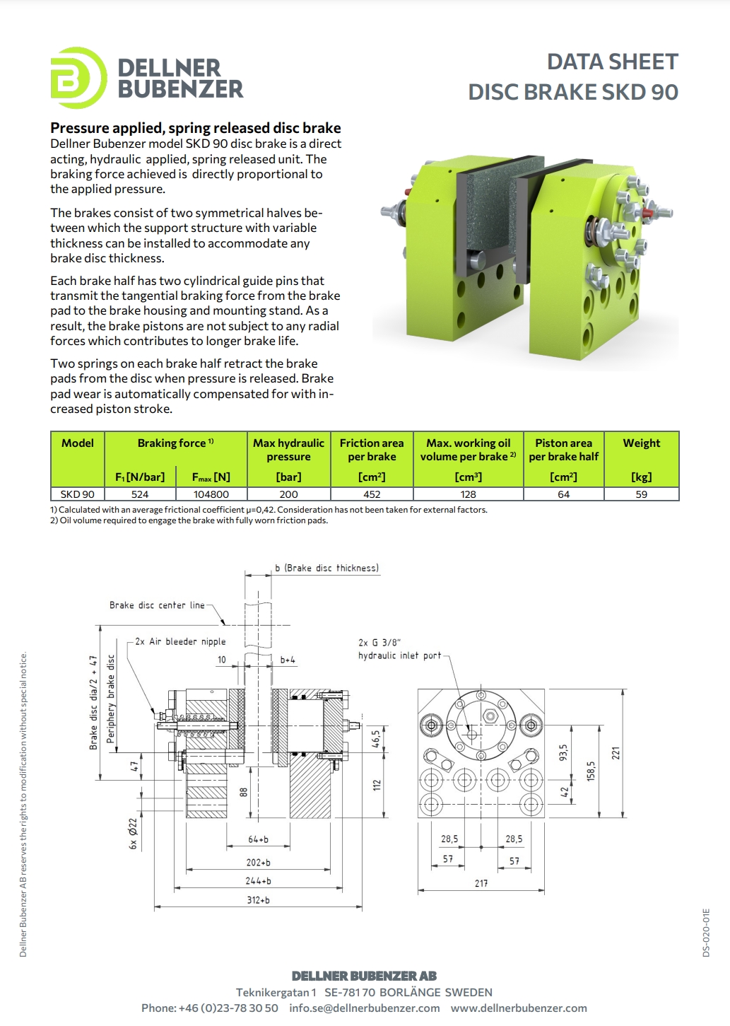 The SKD 90 Active Brakes are part of DELLNER BUBENZER’s SKD series of high-performance disc brakes, engineered for both dynamic and static use in harsh industrial environments. These brakes offer hydraulic or air pressure application, ensuring reliable, proportional braking power that adapts to the applied pressure. The system is available in dual or single housing configurations and is equipped with automatic wear compensation, reducing downtime for maintenance.
