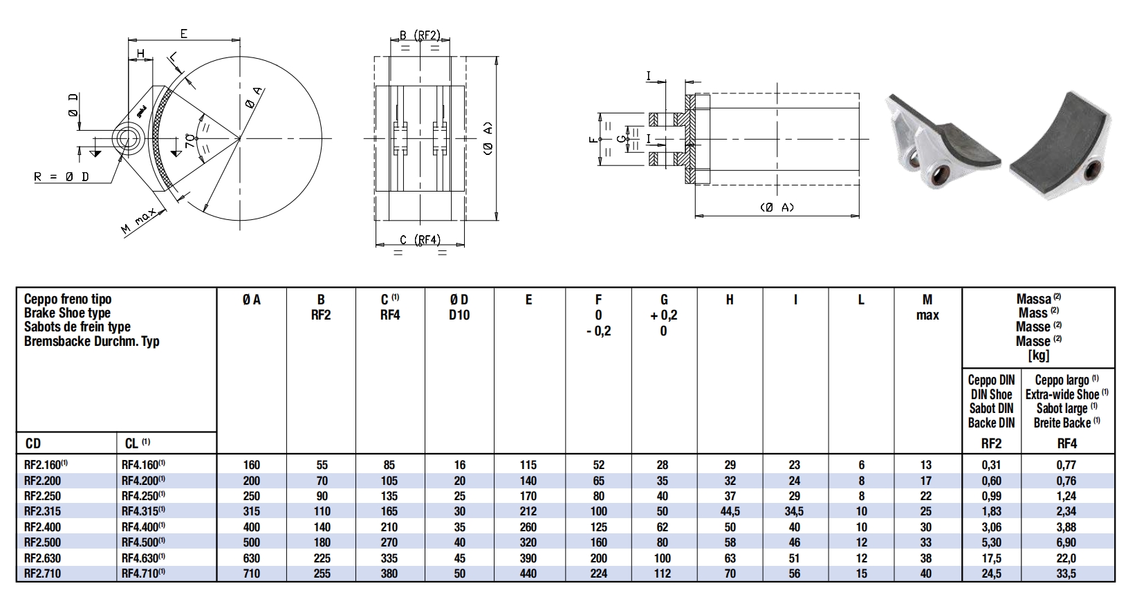 - Extra-wide brake shoes (RF4) for applications requiring enhanced surface contact.