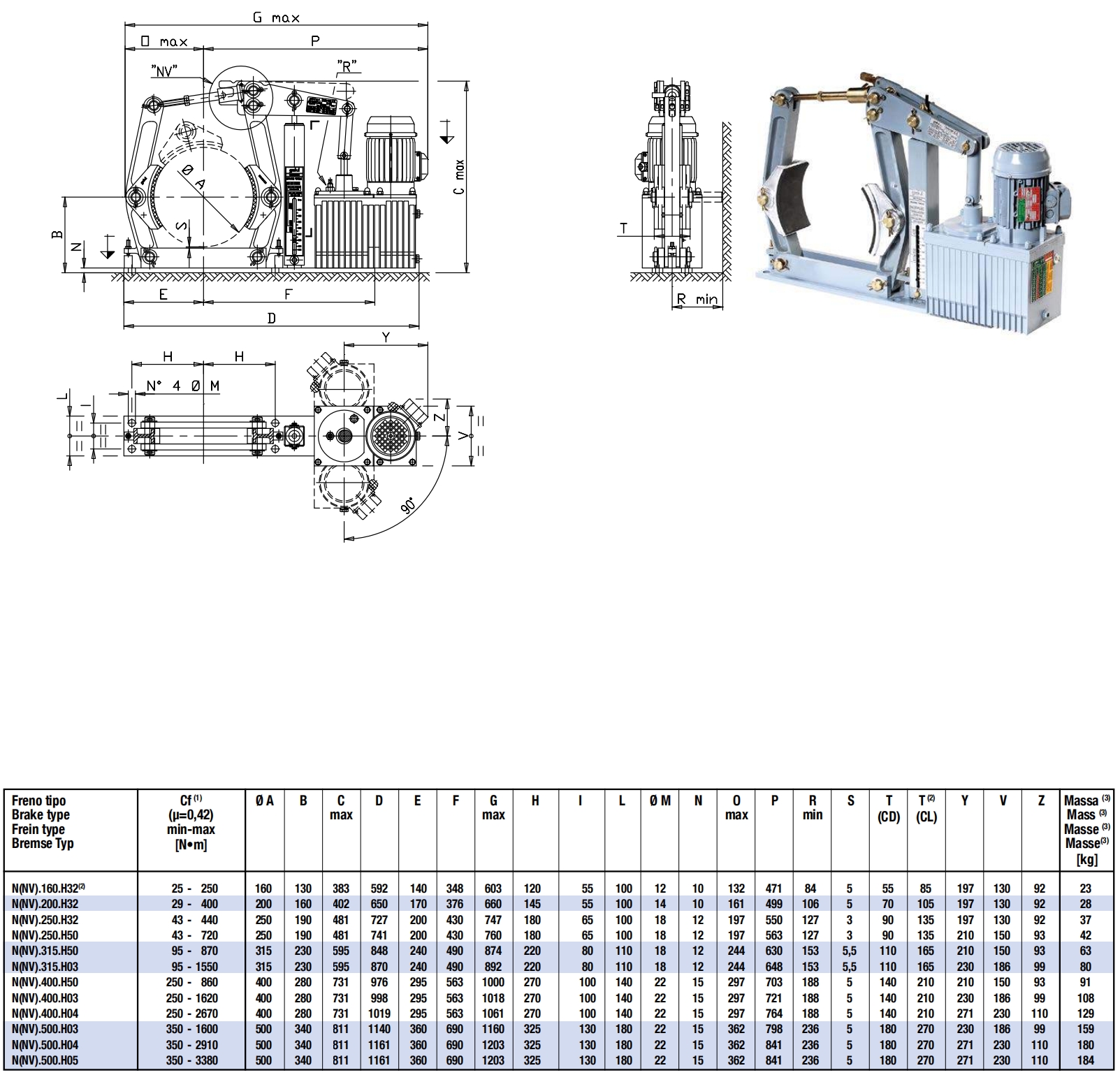 The GALVI DIN Failsafe Shoe Brakes N(NV)...H series are designed to comply with the DIN 15435 standard and are equipped with GALVI “H” a.c. electrohydraulic Thrusters (IP.55, Class F, tropicalized) and an external adjustable main spring set. These brakes are exclusively manufactured for the Italian market.