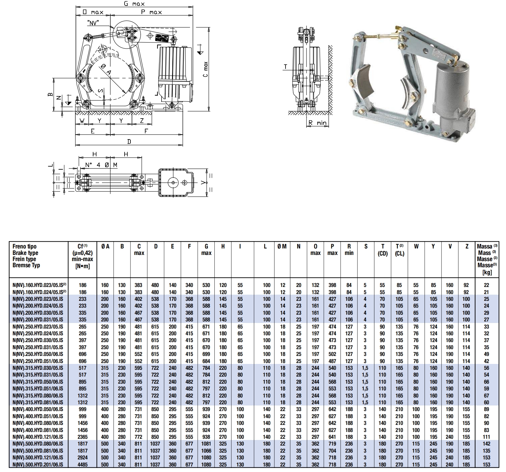 The GALVI DIN Failsafe Shoe Brakes N(NV)...HYD...IS series are designed to meet the DIN 15435 standard. These brakes are equipped with HYDRO GALVI a.c. electrohydraulic Thrusters (IP.65, Class F) that include non-adjustable internal springs and come without an externally adjustable main spring set.