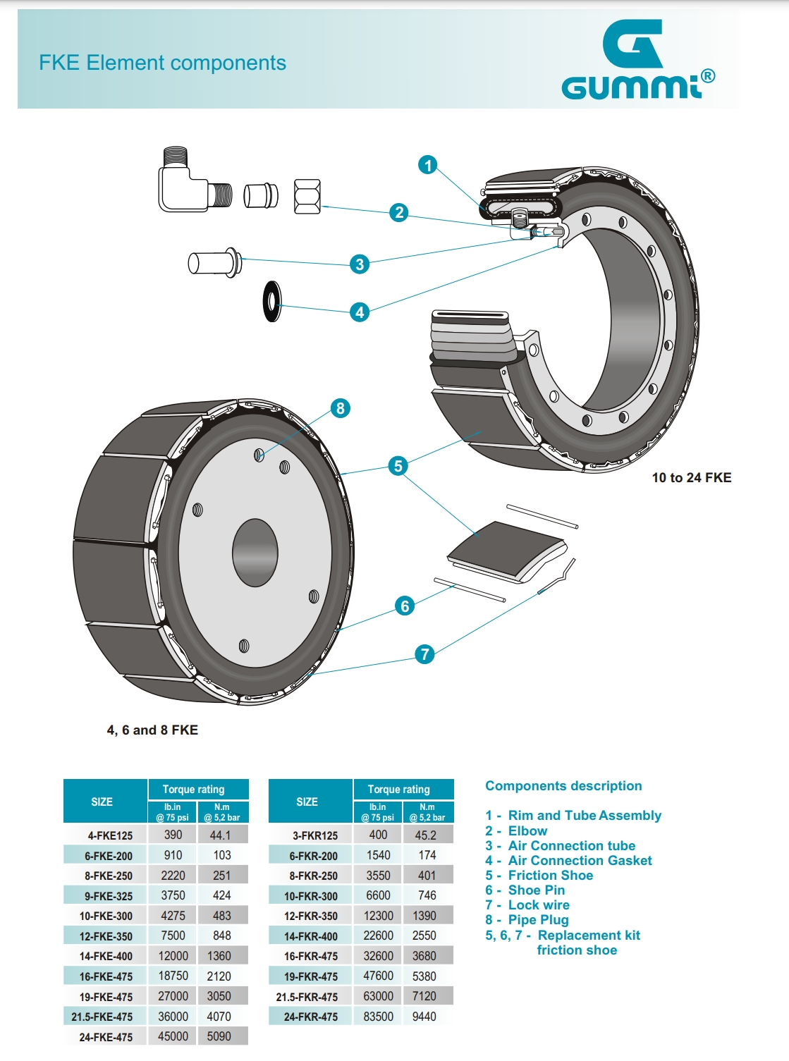 The GUMMI FKE pneumatic elements are designed for low-speed applications, providing smooth starting and stopping loads. These elements function as slip clutches and tensioning brakes, similar in design to the FK elements. Their unique expanding friction design enables them to operate as centrifugal clutches. Made with a reinforced neoprene rubber tube vulcanized to the outer part of a steel rim, the FKE elements deliver efficient torque transmission. When pressurized, the friction shoes expand, engaging the inside diameter of the drum for smooth operation.