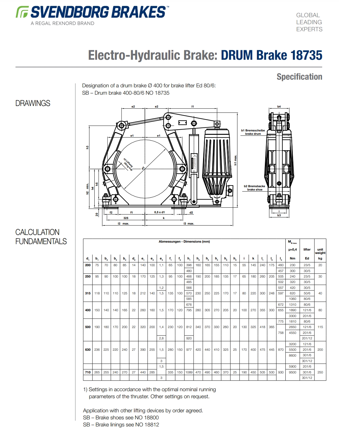 The Svendborg Electro-Hydraulic Drum Brake 18735 is built to DIN 15435 standards, ensuring compatibility and reliability for heavy-duty industrial applications. This drum brake features maintenance-free, self-lubricating bearing bushes and aluminum brake shoes with optional sticked-on brakelinings. The braking torque is fully adjustable via a simple screw mechanism, allowing for real-time torque adjustments that are displayed directly on the spring tube. Equipped with a three-phase alternating current electro-hydraulic lifting device, the brake provides precise control for a wide range of industrial settings.