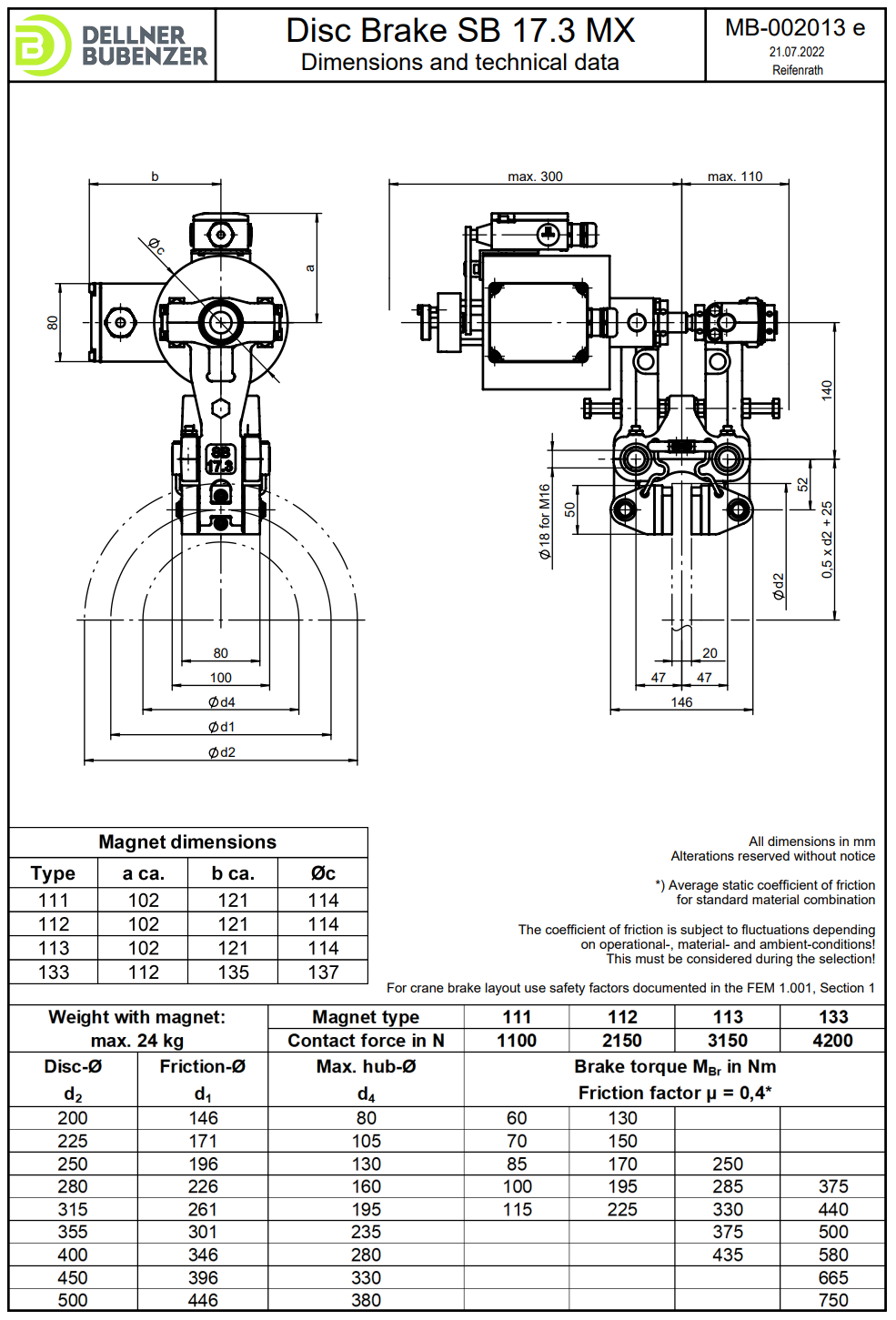 Dellner Bubenzer SB 17.3 MX盘式制动器是一种高性能、多功能的制动器,适用于各种工业应用,如起重设备、船舶、风力涡轮机和机械设备等。